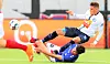 I Gent for en uke siden ble Vålerenga-spillerne statister. I kveld ville de være med på moroa. Her er det Fredrik Oldrup Jensen som setter sitt merke på en Gent-spiller.Foto Geir Olsen / NTB