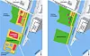 Til venstre: Full utbygging med Fotografihus på Sukkerbiten, stort bygg på Operastranda og stort, oppvarmet sjøbad syd for Sukkerbiten. Til høyre: Sammenhengende friområde på Operastranda og Sukkerbiten, med fri, offentlig adkomst.).