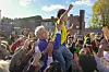 Statsminister Jonas Gahr Støre løfter Mivaan til værs blant en jublende forsamling etter at de deltok sammen i et løp til inntekt for TV-aksjonen på Manglerud skole.Foto: Terje Bendiksby / NTB