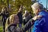 Birgit Skarstein gir statsminister Jonas Gahr Støre et klapp på skuldra for innsatsen under løpet de begge deltok i sammen med elever ved Manglerud skole.Foto: Terje Bendiksby / NTB