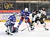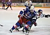 Hovedjobben til back Villiam Strøm er ikke å score, men mot Stavanger fikk han inn et helt avgjørende mål. Her i kamp mot Tommy Kristiansen fra Oilers. Til venstre står veggen Steffen Søberg. Foto: André Kjernsli