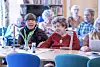 Publikum på St. Hanshaugen seniorsenter koser seg. Til venstre daglig leder Jorid Tharaldsen, som gjerne deltar i sangen. Foto: Torstein Ihle