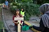 Det har akkurat sluttet å regne, og sola titter gjennom de knallgrønne trærne i parken. Syv-åtte ungdommer er fordelt på flere steder i parken, og ei lita, energisk dame fyker rundt og gir kjappe beskjeder.