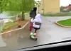 Videoen er filmet fra en bil som kjører opp bak fem unge gutter på elsparkesykler. To av dem kjører mens de sitter på stoler lik de som er stjålet fra nabolagsbakeriet på Løren den siste uken.