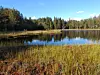 Det var mye vann i marka, men med et rådyrs grasiøsitet hoppet jeg lett og ledig imellom pyttene og over bekker, og kom meg tørrskodd opp til Rypetjern. Selv med utgåtte jaktstøvler. Sunniva hadde slagstøvler. Det var lurt.
