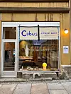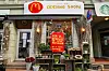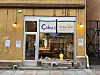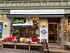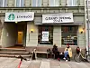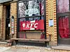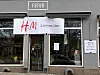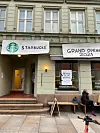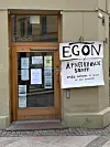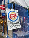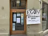 Over restauranten Bass hang det en plakat med restaurantkjeden Egons logo og beskjeden «åpner kanskje snart». Lignende plakater med logoer til McDonalds, Starbucks og KFC er hengt opp over andre småbutikker.
