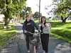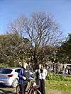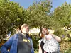 Marte Vike Arnesen og Line Flo (med barn) med epletrærne bak. Foto: Åsmund Berge