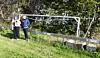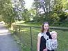 Line Flo (med barn) og Marte Vike Arnesen ved den tidligere fotballbanen med gammelt fotballmål i bakgrunnen. Foto: Åsmund Berge