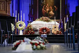 Mange blomsterkranser i kirken.Foto: Heiko Junge / NTB