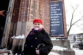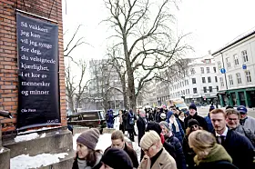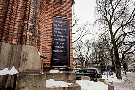 Ole Paus' egne ord på veggen utenfor Kulturkirken Jakob viste vei inn i kirken.Foto: Heiko Junge / NTB