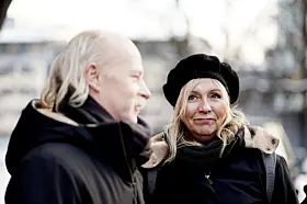 Erik Ulfsby og Ingrid Olava ankommer gravferdsseremonien for Ole Paus i Kulturkirken Jakob.Foto: Heiko Junge / NTB