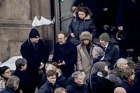 Det var kø inn i kirken før begravelsen til Ole Paus (bildet t.v.). Etter en seremoni med mange taler og mye musikk, ble kisten båret ut av hans nærmeste (bildet t.h.).Foto: Heiko Junge / NTB