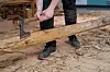 Bendik jobber for tiden med å kløyve ut en trestokk som skal bli kjølen på båten.Foto: Elise Volan