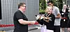 Damen bak ideen, Sabine Schranz, overleverer første ladning med utlånspinner til ansatte ved Deichman Bjørvika.Foto: Christian Boger