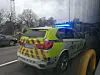 Politi og ambulanse er til stede ved en trafikkulykke på E6 utgående ved Mortensrud.