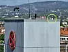 Den lille hvite dotten i høyre del på toppen av tårnet er en måke som har funnet ut at kiten ikke er en farlig rovfugl.