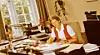 Med ett ringer det på døra. «Ding dong… ding dong…!». Inn trasker en høyreist kvinne med langt blondt hår.