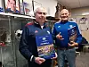 Forfatterne Jarle Teigøy (t.v.) og Bjørn Arild Gjerdalen med hvert sitt eksemplar av jubileumsboka. Nåværende Rosenborgtrener Rekdal følger skeptisk med i bakgrunnen.
