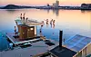Fra nyttår har ikke de flytende badstuene til Oslo badstuforening noe fast tilholdssted. I dag ligger de ved operastranda i Bjørvika.Foto: Henrik Bonnevier / Oslo badstuforening