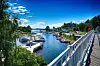 Ferjene tar deg til Oslos øyparadis. I dette bildet venter noen få heldige øyboere på båten fra Lindøya til Aker brygge en solrik morgen i mai 2018. Foto: Tarjei Kidd Olsen