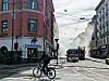 Det blir stans i trikketrafikken. Kjøreledningen for trikken må kuttes for at brannvesenet skal komme til med slukking.