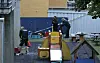 Politi og helsepersonell på stedet i Holmboes gate søndag kveld.