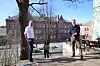 Tidligere FAU-leder Magnus Buflod (til v.), varaordfører Kamzy Gunaratnam (Ap) og bydelpolitiker Gudmund Brede (Ap) på tomta i Eugenies gate, som kommunen kjøper for 83 millioner kroner.Foto: Magnus Buflod