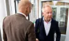 Jonny Enger, tidligere leder i renovasjonsselskapet Veireno, hilser på sin daværende advokat Christian Lundin på vei inn i Follo tingrett høsten 2018. Foto: Tore Meek / NTB scanpix
