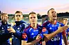 Vålerengas Brage Skaret (t.v.), her med Henrik Udahl, Tobias Christensen og Jonatan Tollås Nation, feirer 5-2-seieren over Jerv.