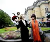Nationaltheatrets egen dronning, nå avdøde Wenche Foss, side som side med dronning Sonja da skulpturen av førstnevnte du kan se i bakgrunnen, ble avduket foran Nationaltheatret i 2007.Foto: Stian Lysberg Solum / NTB