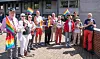 I forbindelse med Pride 2021 samler Brit Lie og Solvår Foss seg med andre eldre skeive ved Kampen omsorgsbolig for å heise regnbueflagget til topps.Foto: Torstein Ihle