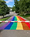Et robust regnuesymbol som det blir vanskelig å stjele ble malt på veien ned til skolegården på Bøler skole denne uka. På Bøler har de klassesamtaler om Pride-uka og hva som er bakgrunnen for mangfoldskampen til LHBTQ-bevegelsen.Foto: Britt Bøymo