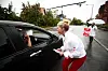Cecilie Lyngby (FNB) deler ut løpesedler til bilister samme dag som Oslos bomring ble utvidet i fjor sommer. Foto: Lise Åserud / NTB scanpix