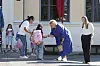 Høyre-leder Erna Solberg og nestleder Tina Bru hilser på førsteklassingene på Bryn skole.Foto: Ole Berg-Rusten / NTB