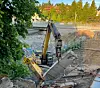 En bil kjørte inn i et skilt ved stasjonen på Brynseng og stakk fra stedet lørdag. T-banen her er stengt for trafikk denne sommeren på grunn av omleggingsarbeid.