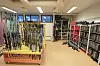 Vi går ned en liten trapp. Veggene er malt i gult, rødt oransje og lilla farger og ved trappa står logoen til Bua i stor skrift. Bak disken står ski- og fritidsutstyr på rekke og rad, klart til utlån.