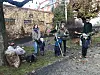 Beboerne i det tradisjonsrike "Krystallpalasset" på Torshov har sin årlige høstdugnad. Her har de dratt i gang en dugnad for å få stoppet det de mener er ødeleggende byggeplaner i bakgården deres. F.v. Jorid Gjerde, Alma (3), Finn (5), Stine Hoel, Ivar Kvaal og Bo (5.)Foto: Paul Torvik Nilsen