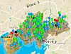 Her finner du stolpene i bydelene Frogner, St Hanshaugen og Grünerløkka. Stolpene er farget etter tilgjengelighet og vanskelighetsgrad, fra de letteste blå, via grønn og rød til de vanskelige svarte stolpene.Illustrasjon: Nydalens Skiklub