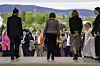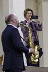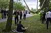 Dronning Sonja sammen med kunstnere og musikere under åpningen av keramikkutstillingen med verk av avgangselever fra Kunsthøgskolen i Oslo (KHiO) i anledning sesongåpningen av Oscarshall.Foto: Cornelius Poppe / NTB