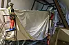 Gokstadskipet var pakket inn duk før flyttingen ble gjennomført 29. oktober. Her fjernes den i forkant av prosessen.Foto: Mårten Teigen / Vikingtidsmuseet