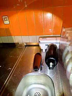 Såpedispenser ved håndvasken lå løst på disken. På en kran inne