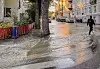 Mye vann i gatene etter at det oppsto en omfattende vannlekkasje ved Vestkanttorget tirsdag kveld. Petter Pilgaard t.h. var blant dem som forsøkte å feie bort løv fra sluk i området.Foto: Heiko Junge / NTB