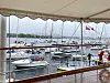 Gjennom sitt eget kamera fanget dronning Sonja en glad kongefamilie som hilste Oslo seilforenings båtkortesje fra dekket på kongeskipet Norge. Store og små båter myldret rundt skipet i det klissvåte været.
