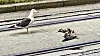måke midt i veien like ved bussterminalen, med noe på størrelse med den selv