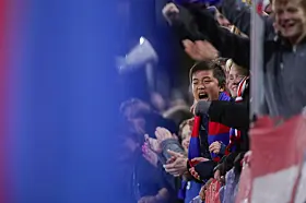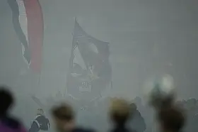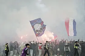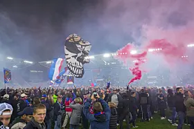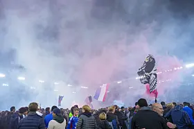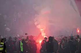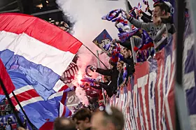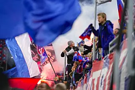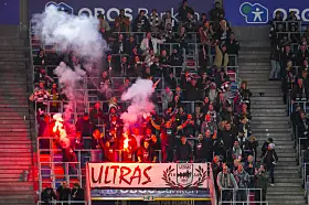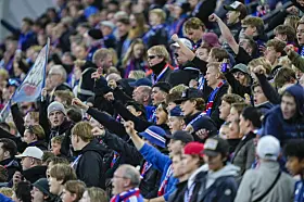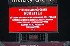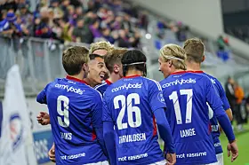 Vålerenga-supportere jubler under 1. divisjonskampen i fotball mellom Vålerenga og Mjøndalen på Intility Arena onsdag kveld der det etter 4-2-seier til hjemmelaget, ble klart at laget fra Oslo øst er klare for Eliteserien igjen, etter en sesong i OBOS-ligaen.