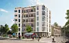 Etterstadgata 2 - 6 ferdig utbygget sett mot gamle Strømsveien i nye illustrasjoner fra arkitektfirmaet LINK og OBOS. Skismørningsfabrikken er den lave hvite bygningen.Illustrasjon: LINK / OBOS