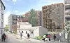 Sotakiosken ved den planlagte boligblokka med den gamle skismørningsfabrikken bygget om bak til høyre.Illustrasjon: LINK / OBOS