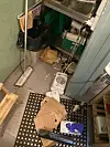 kaotisk og rotete lokale med glasskår spredt utover gulvet.