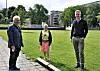 I bakgrunnen skimtes Botsen, som er fredet og ikke aktuell å tilby NRK. Fra v. Åge Petter Christiansen (Ap), og fra Klosterengas Venner Kim Noguera Gabrielli, Vebjørn Torsetnes og foran Gerd Bånerud.Foto: Arnsten Linstad