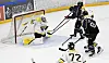 Først vil ikke dommerne godkjenne scoringer. De mener pucken ikke er over streken. Men etter å ha sett på TV-bilder godkjenner de til slutt scoringen.